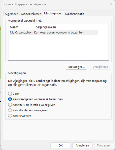Bepaal onder machtigingen wat je collega kan zien in jouw agenda, na het toevoegen krijgt je collega een mail over het delen: