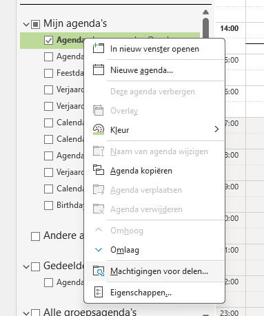 Klik met de rechtermuisknop op je eigen Agenda, kies voor machtigingen voor delen: